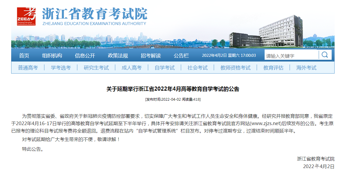 原定于2022年4月16-17日举行的浙江自学考试延期至下半年举行,具体开考安排浙江省教育考试院官方网站后续会发布公告。