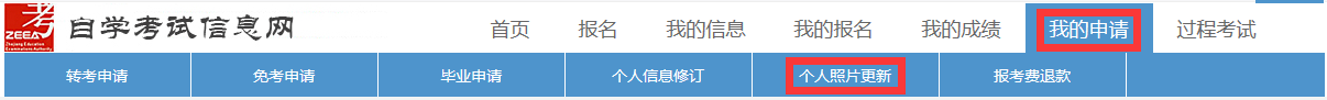 至报名当时注册已满5年、但未重新上传近期拍摄的照片的续考生,系统提示需要更新照片,无法进入报名页面。考生需要在“我的申请-个人照片更新”中上传照片,经审核通过后,方可进入报名页面。