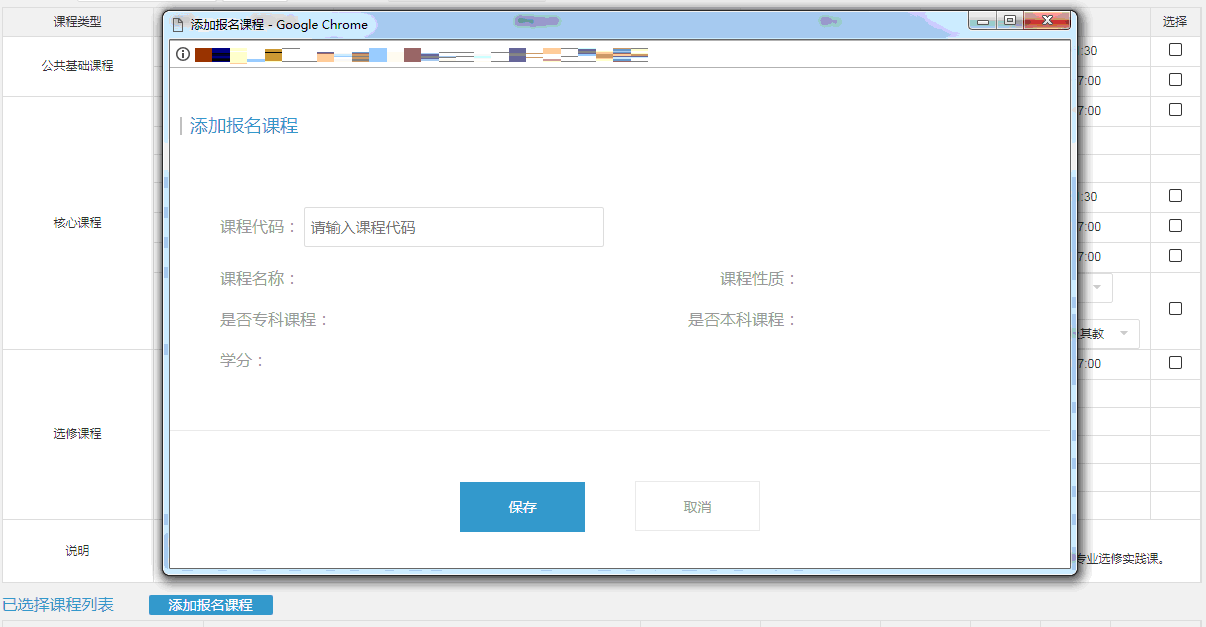 (2)选择专业,勾选课程,如需报考页面所列课程以外的课程,点击“添加报名课程”,在添加报名课程页面填写所需报考课程的代码并保存。勾选论文课程时,还需选择论文指导院校和论文选题。理论课程同一考试时间只能选择1门课程。