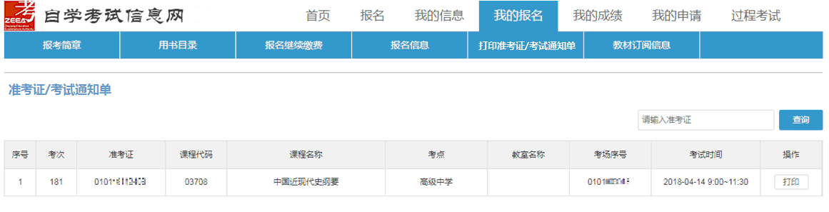 考前5天,点击“我的报名-打印准考证/考试通知单”菜单进入准考证/考试通知单页面,点击“打印”按钮进行打印准考证/考试通知单操作。