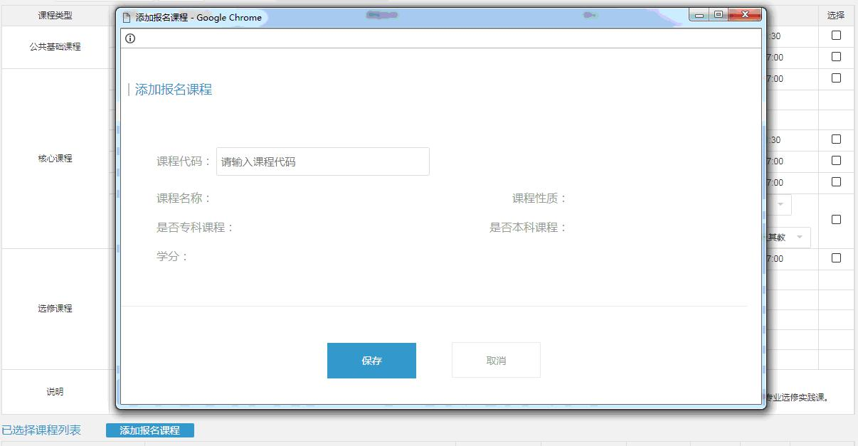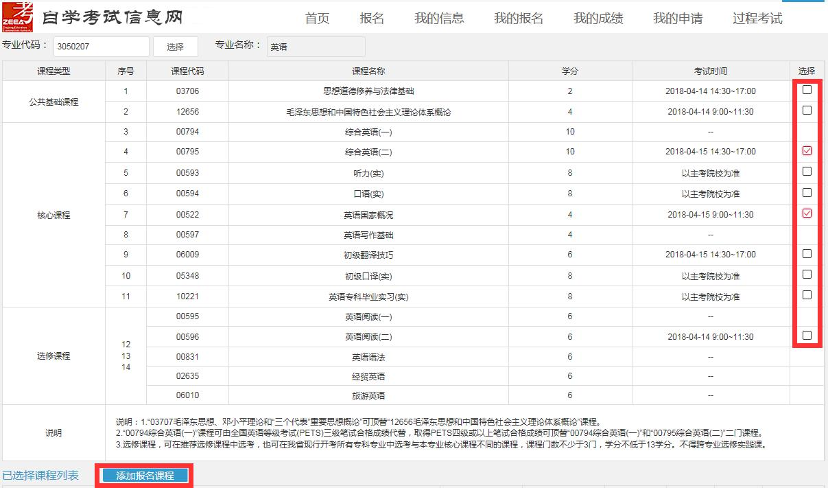 (3)选择专业,勾选课程,如需报考页面所列课程以外的课程,点击“添加报名课程”,在添加报名课程页面填写所需报考课程的代码并保存。勾选论文课程时,还需选择论文指导院校和论文选题。理论课程同一考试时间(同一个半天)只能选择 1 门课程。