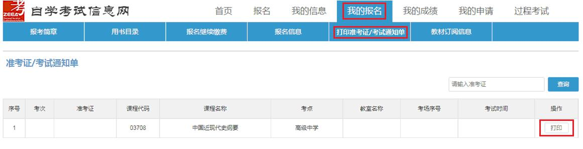 7 月 27 日起,考生登录自学考试信息网(zk.zjzs.net)打印“准考证/考试通知单”。“我的报名”-“打印准考证/考试通知单”-“打印”