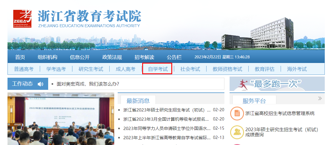 浙江自考报名官网是浙江省教育考试院,有关于浙江自考的信息,考生也可以到浙江省教育考试院进行查看,浙江省教育考试院官网主页顶部菜单栏中,点击"自学考试"即可查看浙江自考相关资讯。