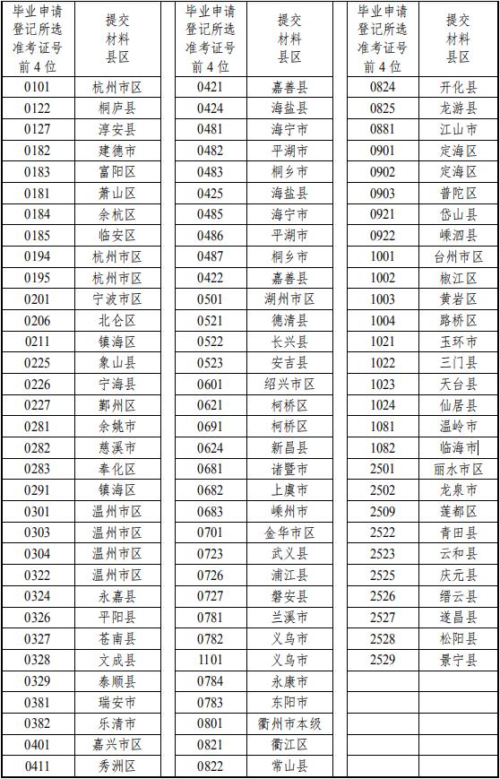 浙江省自学考试毕业申请登记所选准考证与提交材料县区对照表