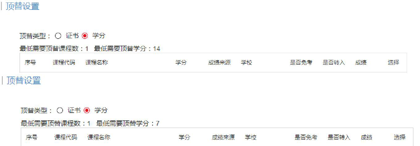 注意事项:使用等级证书的,证书编号填写等级证书上的“证书编号”,成绩填写“合格”。使用笔试合格证或成绩通知单的,证书编号填写笔试合格证或成绩通知单上的“准考证号”,成绩填写实际成绩。选择若干课程学分顶替,被选择的课程无法再被选为选修课程。
