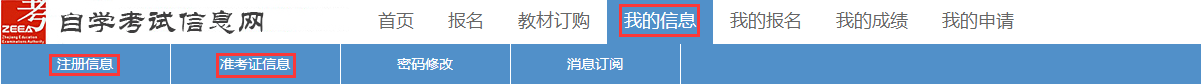 自学考试信息网(zk.zjzs.net)-我的信息-注册信息、我的信息-准考证信息