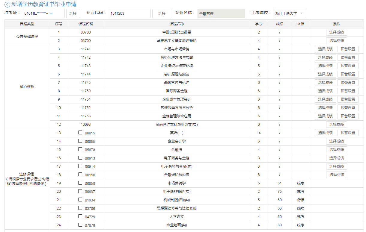 C.1020320中小企业经营管理(本科)、1011203金融管理(本科)、1011204商务管理(本科)、3020313销售管理(专科)、1020314销售管理(本科)、1020229物流管理(本科)、3020228物流管理(专科)等专业各类承认学分的证书或证书课程合格证顶替自考课程。顶替设置时,准考证号填写证书的证书号或证书课程合格证的准考证号,成绩填写合格(证书)或者实际成绩(证书课程合格证)。按下列对应关系进行顶替设置,否则会导致毕业申请审核通不过。