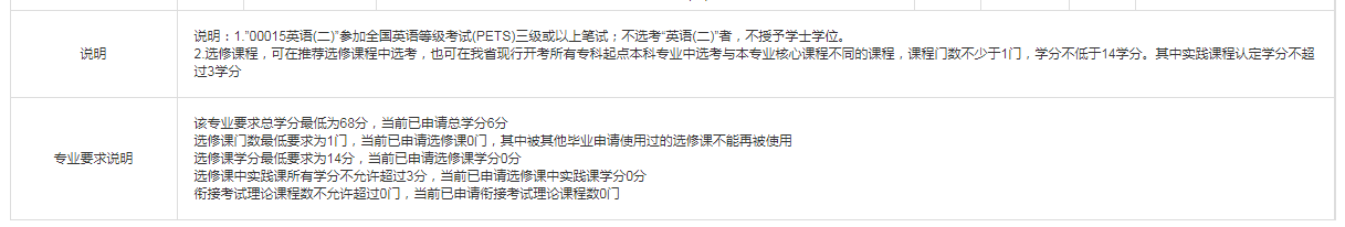 考生选定准考证、专业、主考院校后,系统自动显示考生申请毕业专业的计划及考生已取得的对应课程、成绩(包括免考)。考生须清楚计划下列的“说明”和“专业要求说明”,特别是其中关于选修课程的说明。考生勾选用于选修课程的课程。