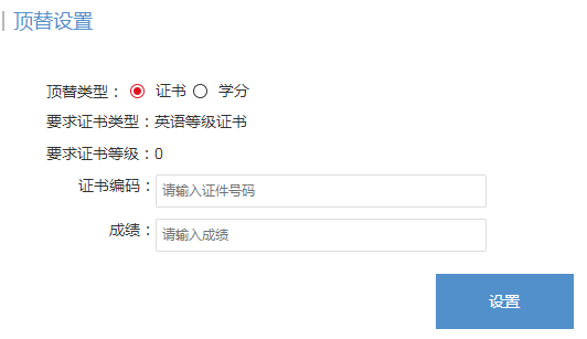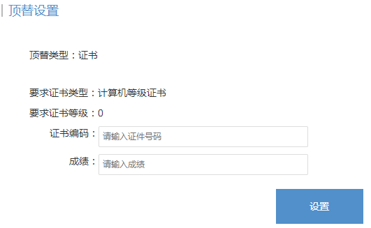 A-1.使用证书或笔试成绩顶替。顶替设置时,使用等级证书的,证书编号填写等级证书上的“证书编号”,成绩填写“合格”;使用笔试合格证(或合格成绩通知单)的,证书编号填写笔试合格证或成绩通知单上的“准考证号”,成绩填写实际成绩。