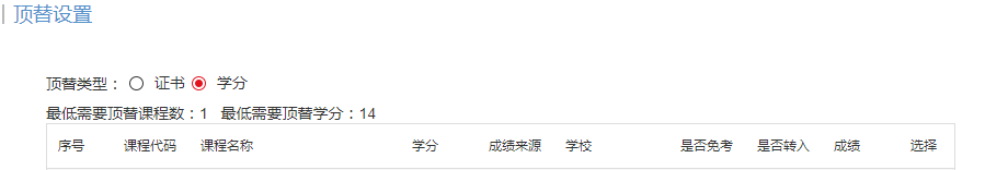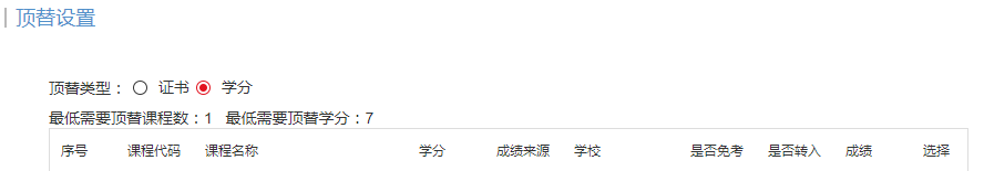 考生使用证书或证书课程或若干课程学分来顶替申请毕业专业中的相应课程,使用顶替设置。考生须保证填写的内容准确无误,否则会导致毕业申请审核通不过。