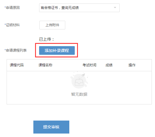 D.添加补录课程,填写并保存,免考课程补录的,成绩填写“免考”。提交审核。