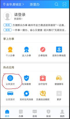 步骤一:手机扫码下载“浙江政务服务”移动客户端并安装;打开浙江政务服务APP,注册重登录,主界面上点击“公共支付”。