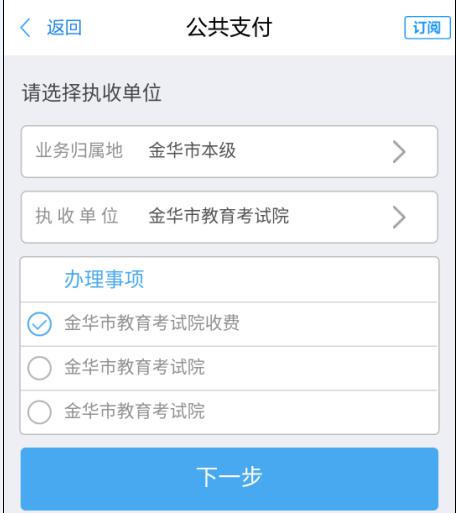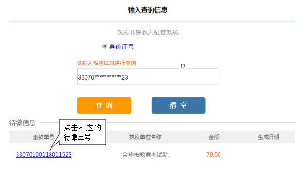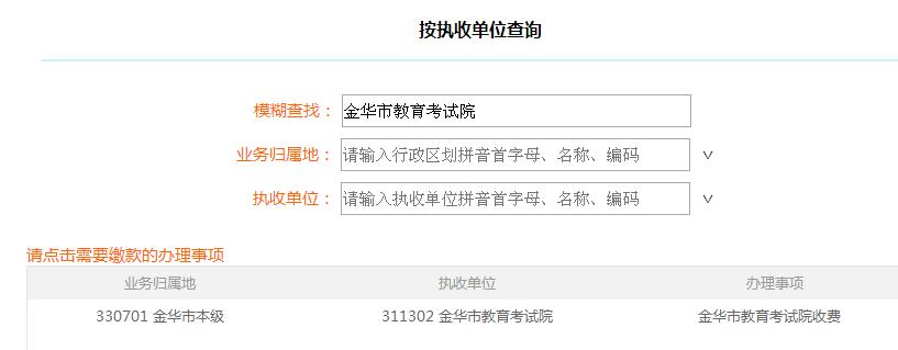 按执收单位查询关键字输入“金华市教育考试院”后,点击执收单位中的“金华市教育考试院”;