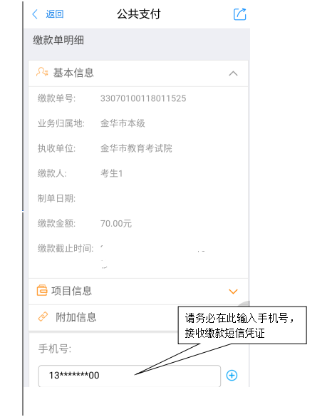 核对缴款单明细:缴款人姓名、付款金额等信息(可点击“项目信息”及“附加信息”查看缴款单明细),特别是缴款人姓名是否有误,以防错缴。