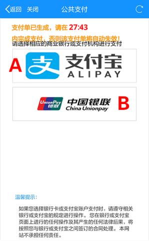步骤四:点击“下一步”进入电子支付,在支付单生成后,请在规定时间内完成支付。点击“支付宝”或“中国银联”图标,选择支付方式,并完成电子支付。