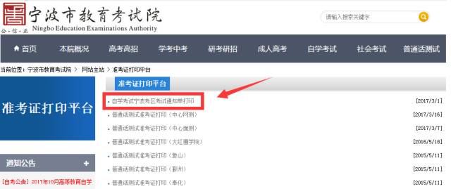 2、点击“自学考试宁波考区考试通知单打印”栏目。