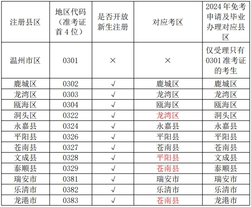 (一)考生应按自己所在县(市、区)选择注册县区,原“温州市区”考区不再接受新生注册,在温州市区的考生可选择鹿城区、龙湾区、瓯海区、洞头区进行注册。