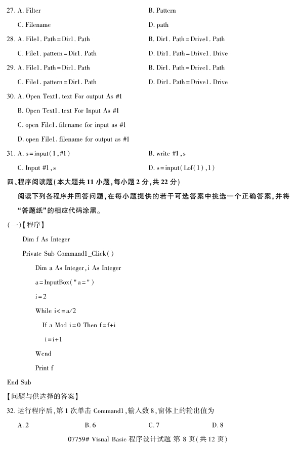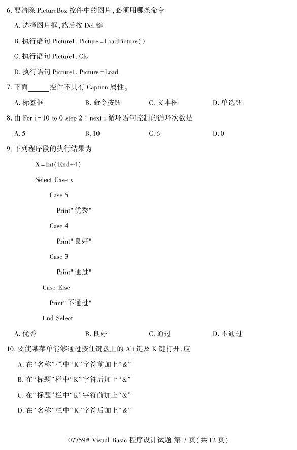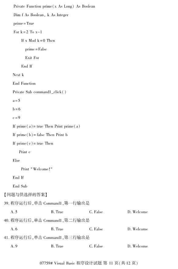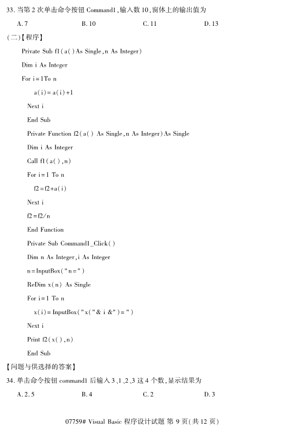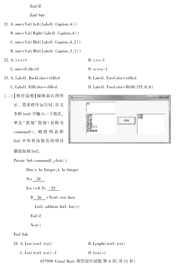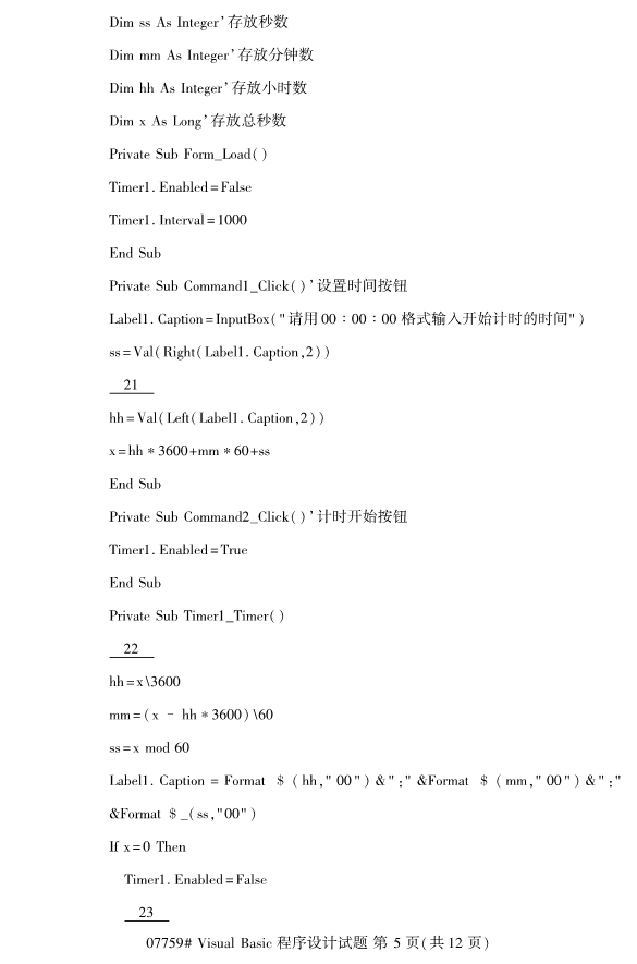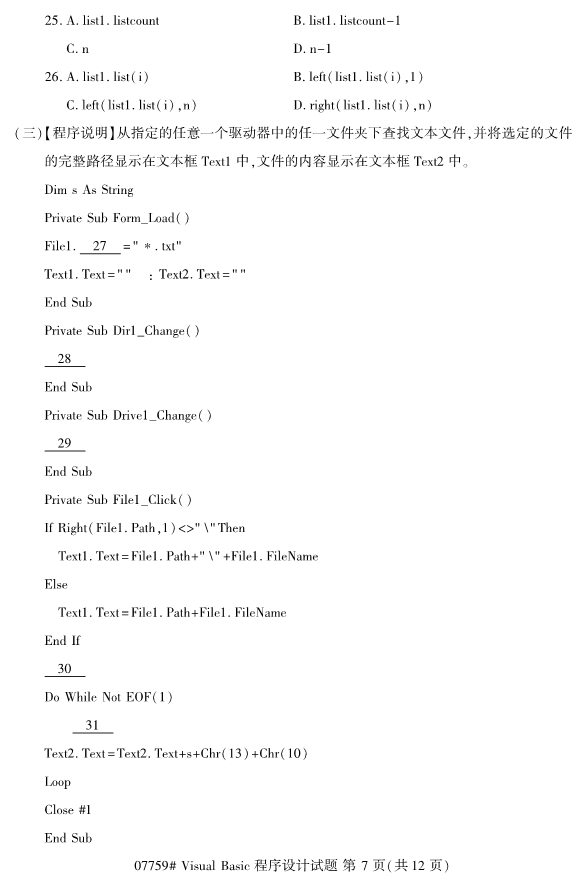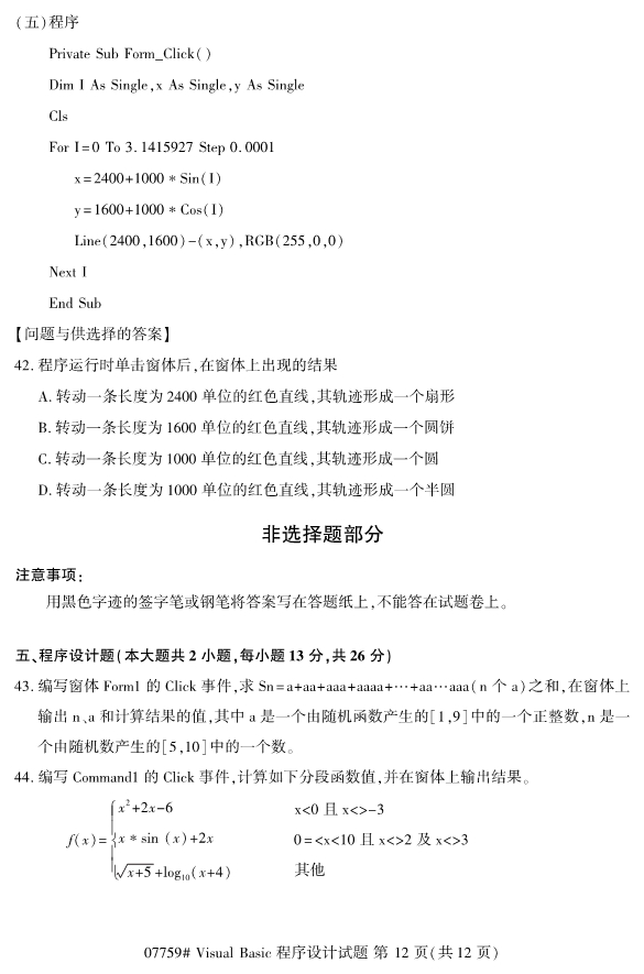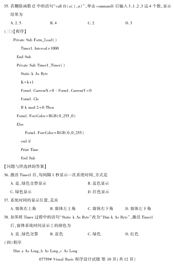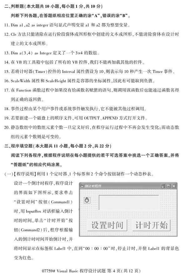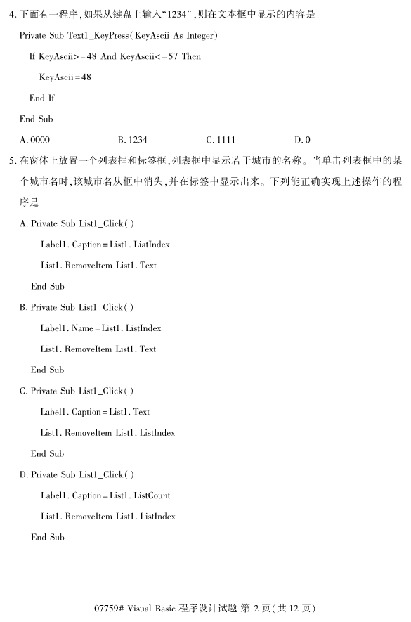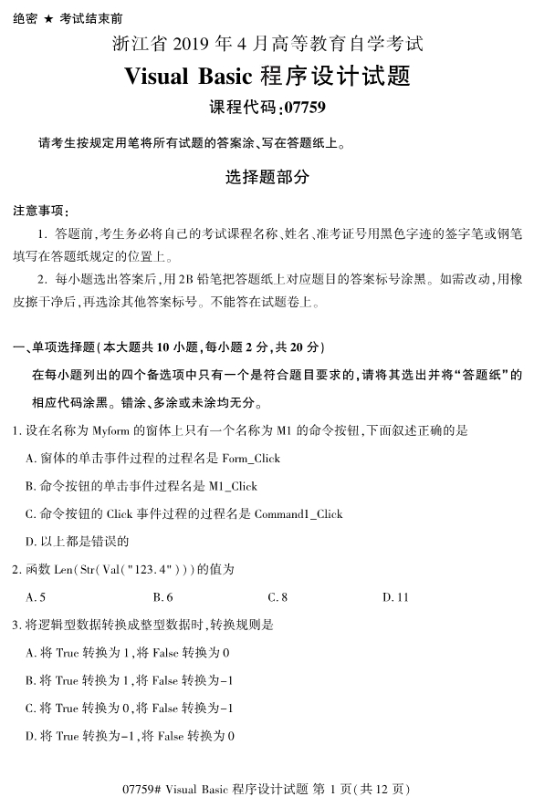 浙江2019年4月自考visualbasic程序设计试题