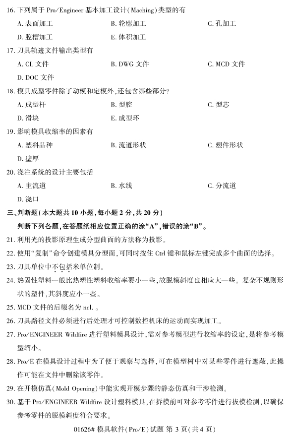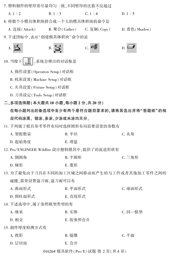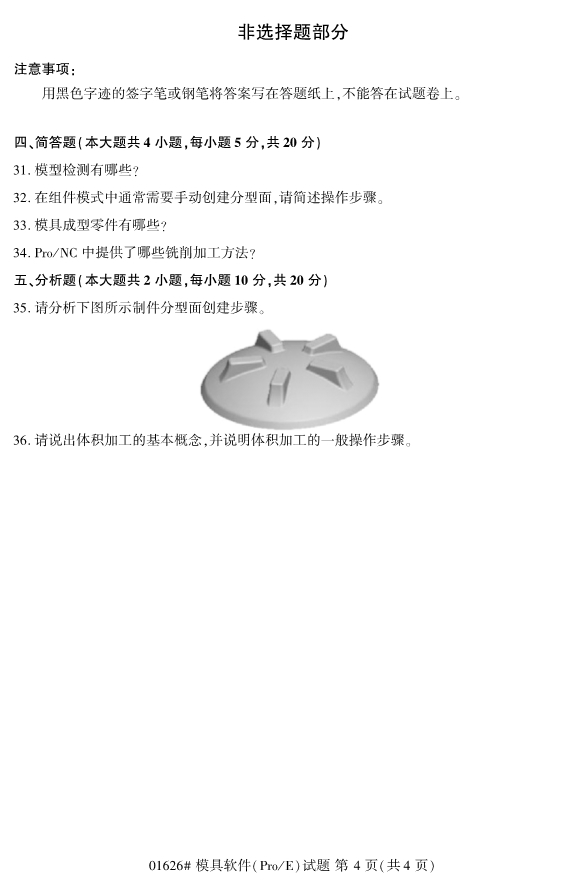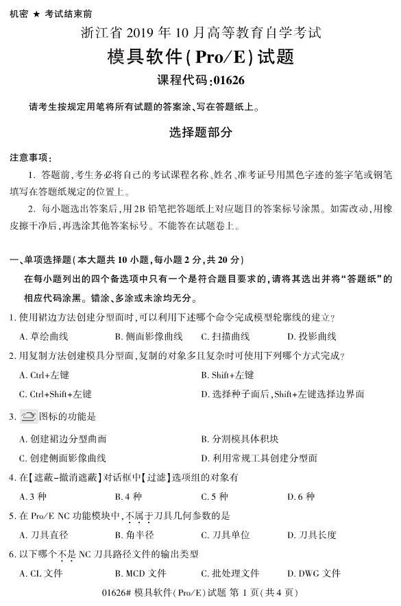 全国2019年10月自考01626模具软件(PRO_E)试题