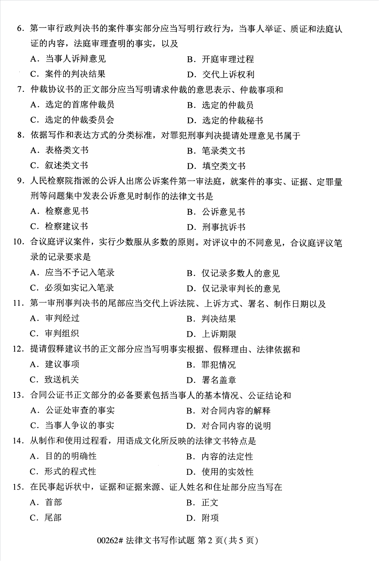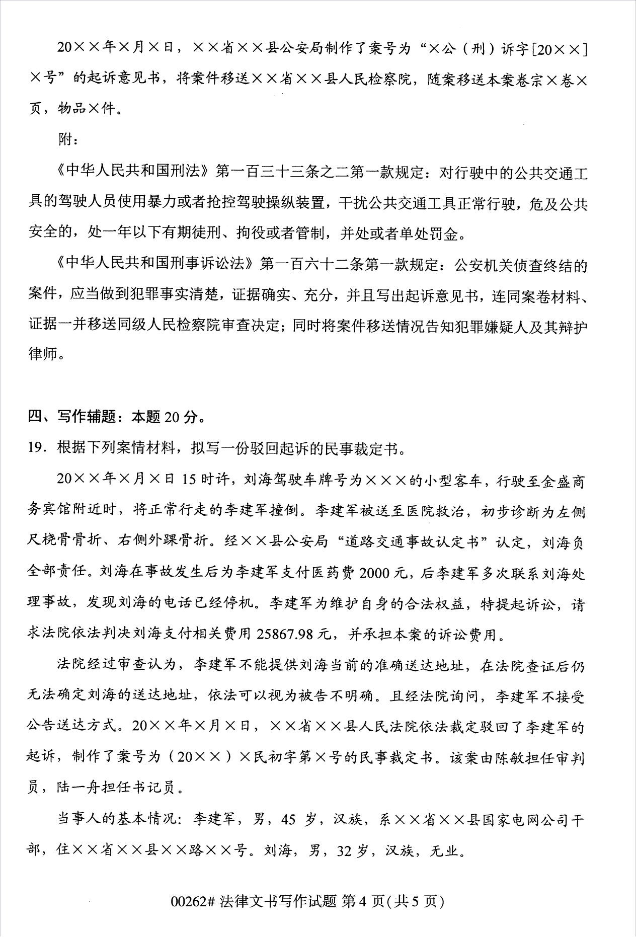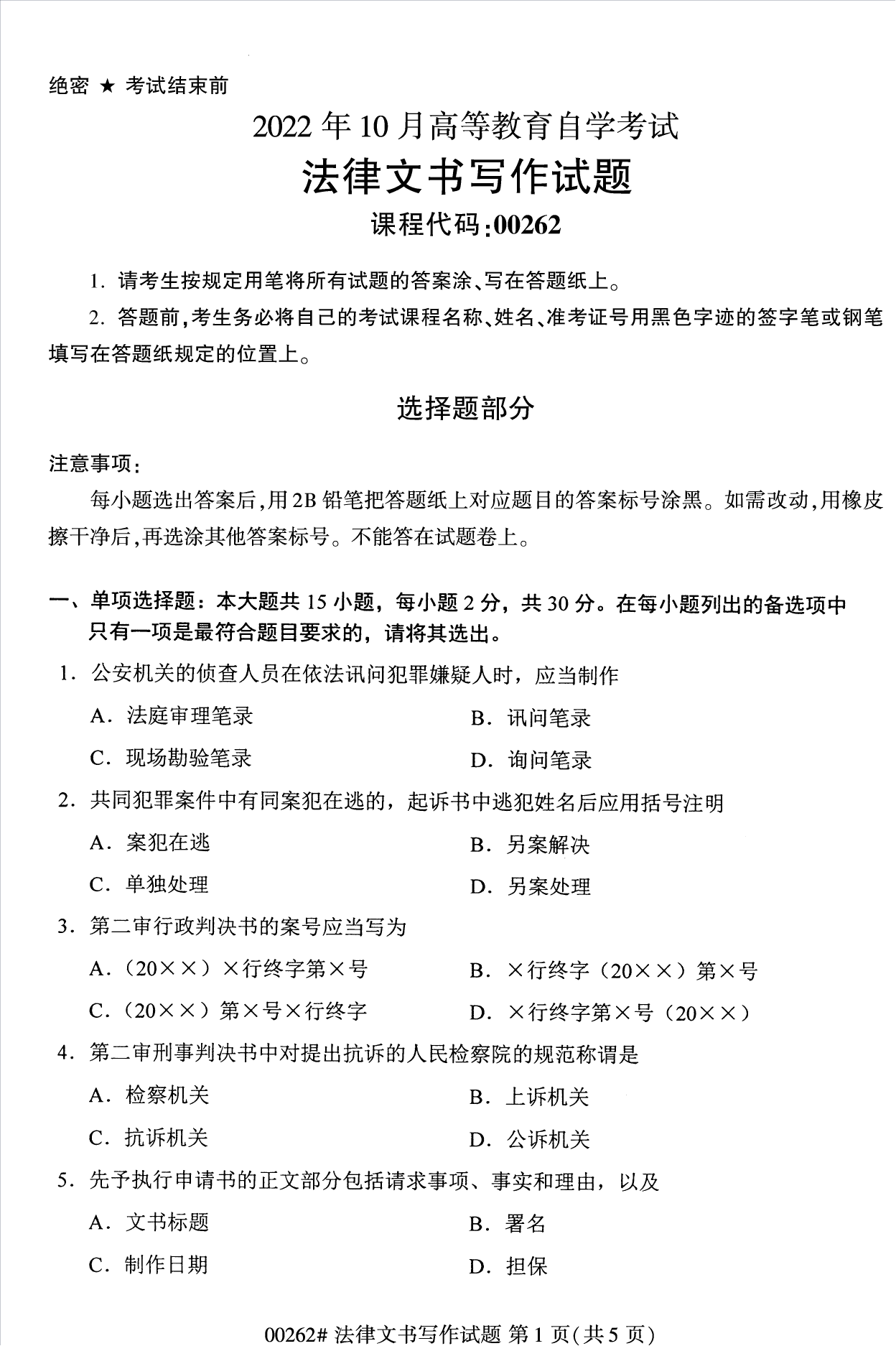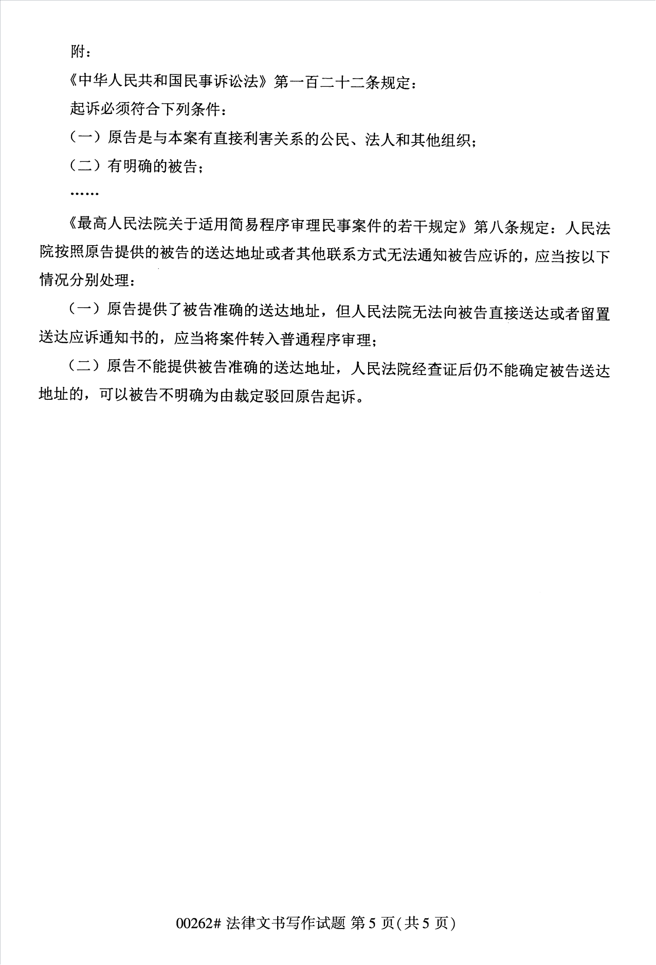 2022年10月浙江自考00262法律文书写作试题