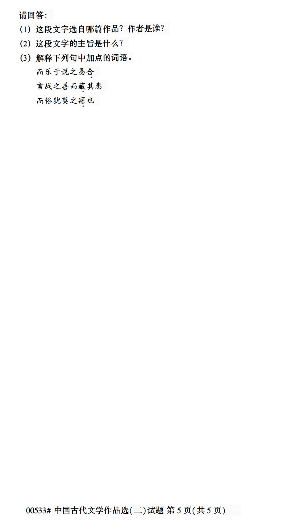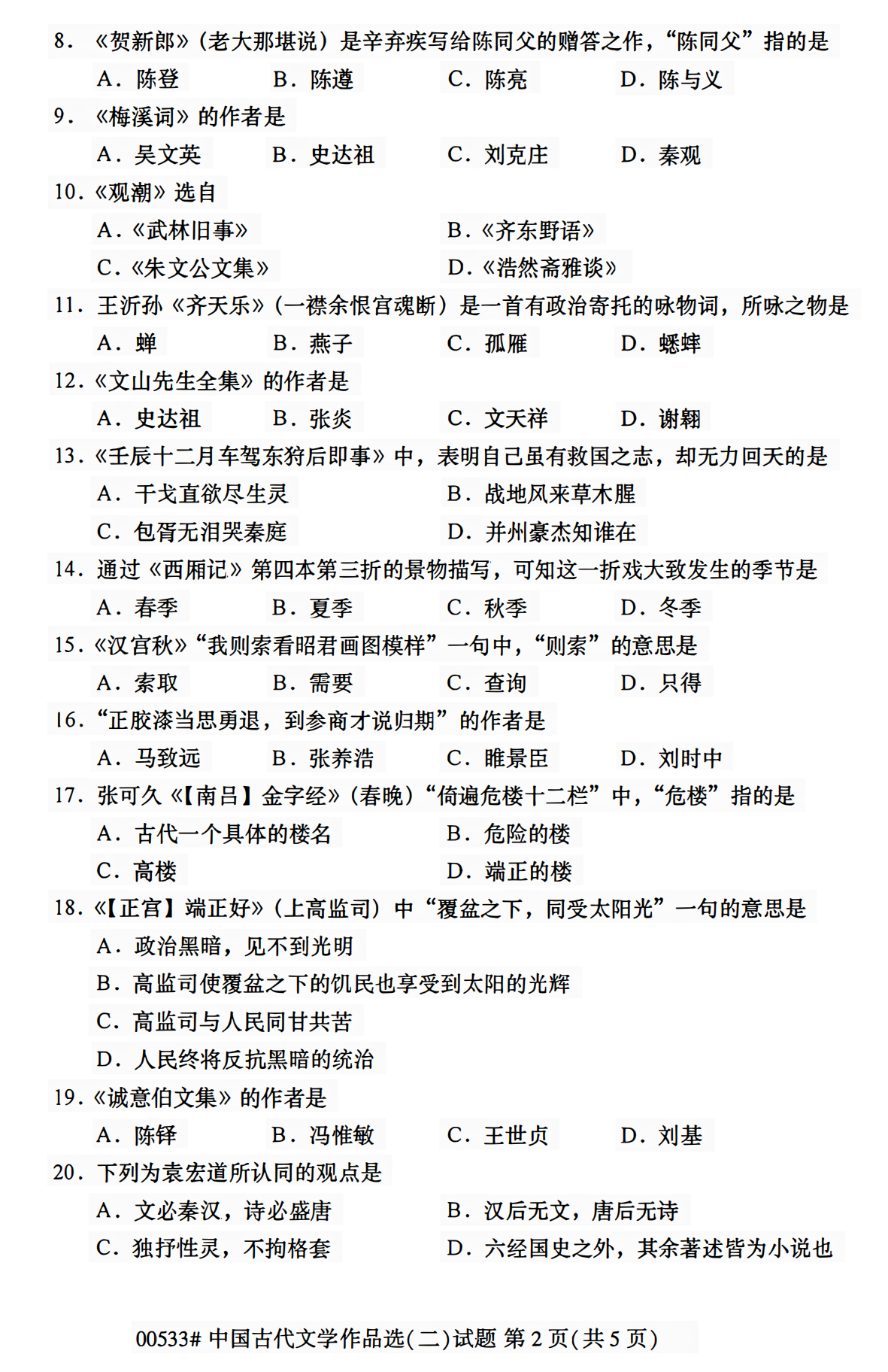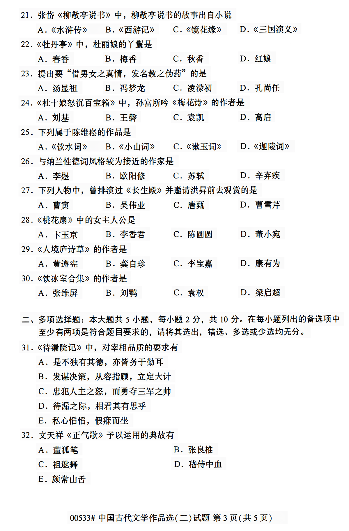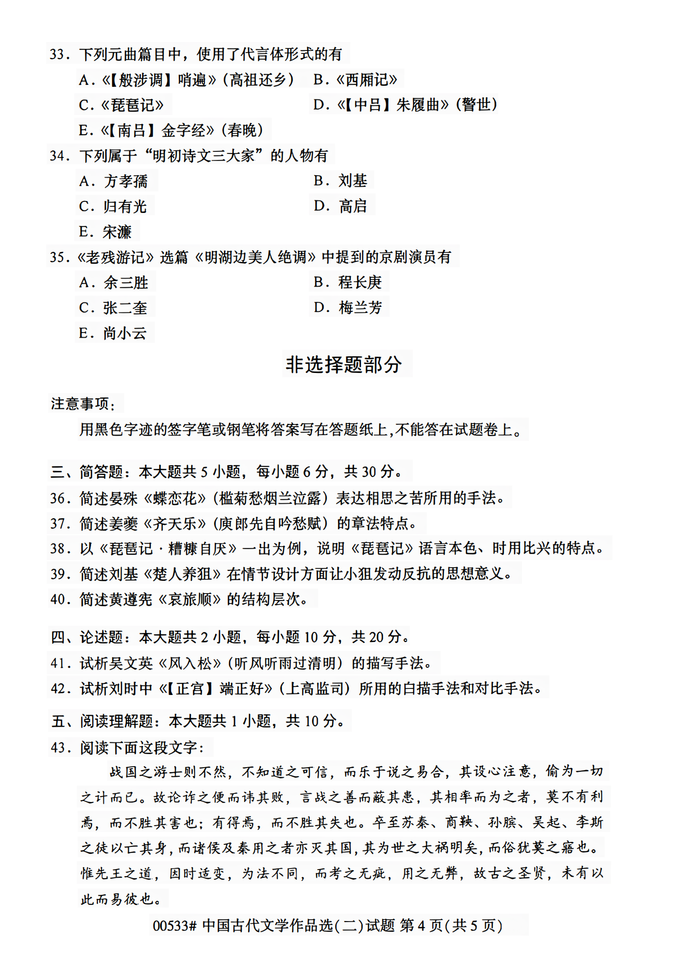 2023年4月浙江自考00533中国古代文学作品选(二)试题