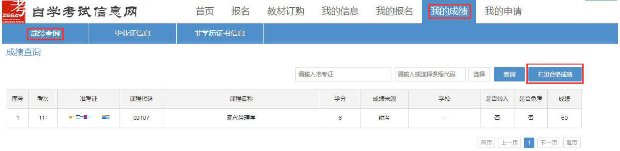确定个人信息完整、正确后,查询课程成绩,打印合格成绩。
