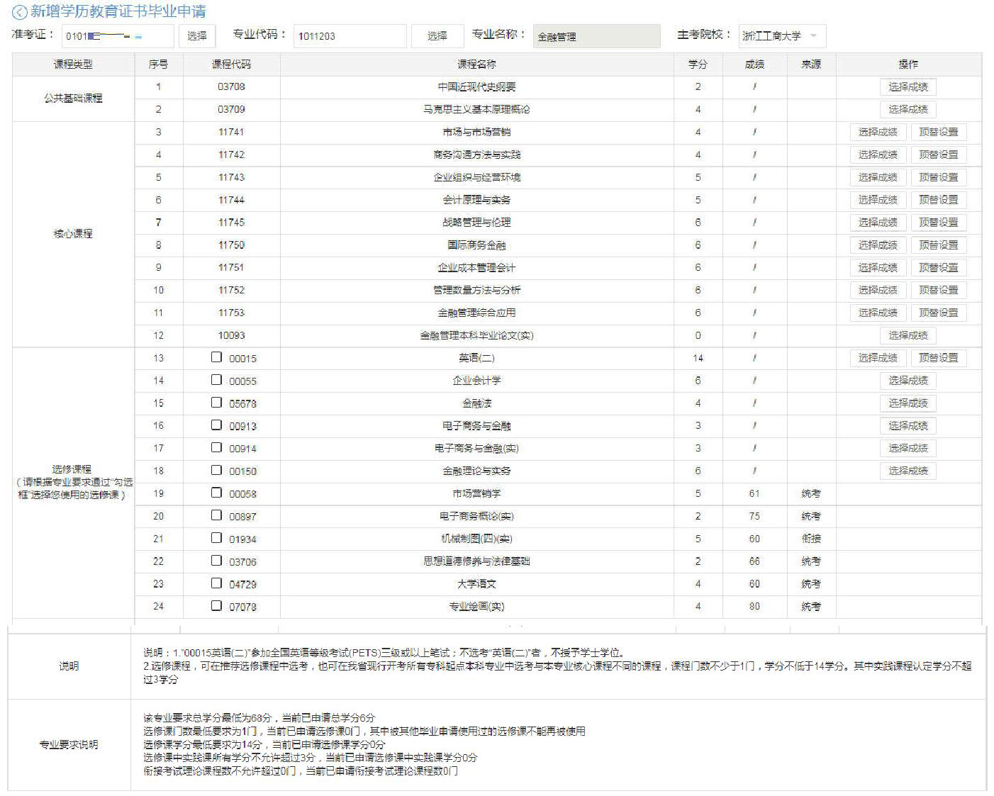 考生选定准考证、专业、主考院校后,系统自动显示考生申请毕业专业的计划及考生已取得的对应课程、成绩(包括免考)。考生须清楚计划下列的“说明”和“专业要求说明”,特别是其中关于选修课程的说明。考生勾选用于选修课程的课程。