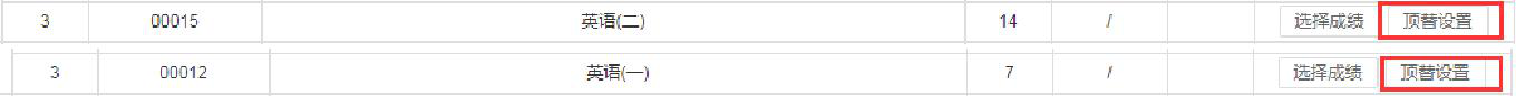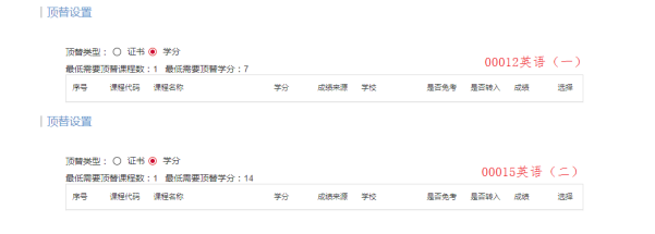 “00015英语(二)”课程如既有全国英语等级考试证书(或笔试成绩)顶替,又有申请免考或课程学分顶替的,考生如要参与学位初审排定,则须选择全国英语等级考试证书(或笔试成绩)顶替成绩。