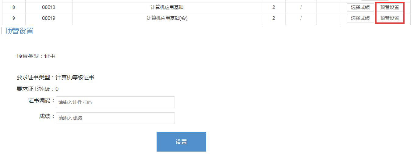 B. “00018/00019计算机应用基础(含实)” 课程使用全国计算机等级考试等级证书顶替。顶替设置时,“00018计算机应用基础”和“00019计算机应用基础(实)”都须进行顶替设置,证书编号填写等级证书上的证书编号,成绩填写“合格”。系统显示为“7”。