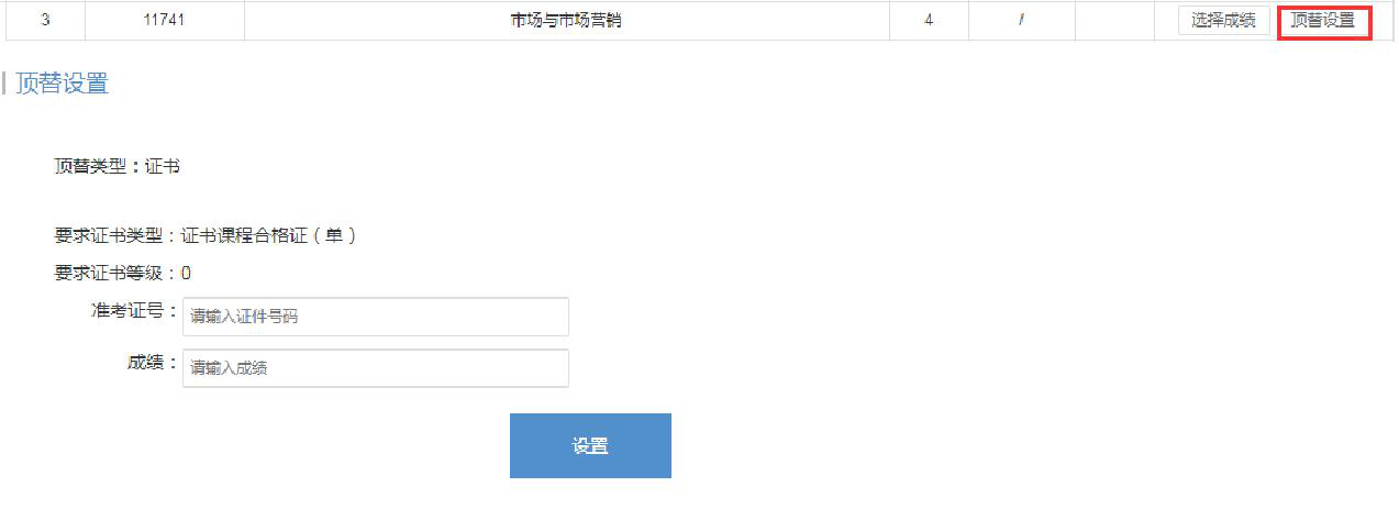 考生使用证书或证书课程或若干课程学分来顶替申请毕业专业中的相应课程,使用“顶替设置”。考生须保证填写的内容准确无误,否则会导致毕业申请审核通不过。