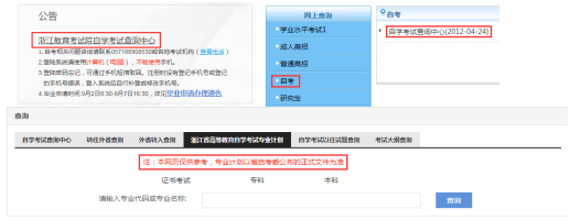 浙江省教育考试院自学考试信息网(zk.zjzs.net):首页-浙江教育考试院自学考试查询中心-浙江省高等教育自学考试专业计划。