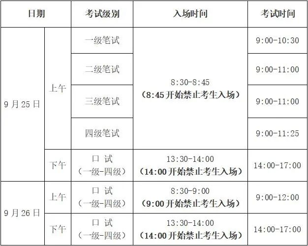 全国英语等级考试时间为9月25-26日,开考一级、二级、三级、四级,我省有5万余名考生报名。考生请登录报名网站下载、打印准考证。具体考试安排如下: