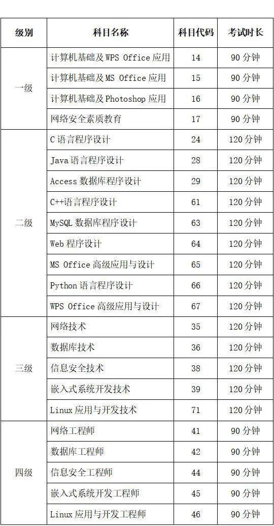 全国计算机等级考试将于9月25-27日在全省25个考点分批进行。本次开考四个级别共23个科目,全省共有1.9万余考生参加。考生请及时登录报名网站自行下载并打印准考证,具体考试时间和考场地点见准考证。各级别科目考试时长见下表: