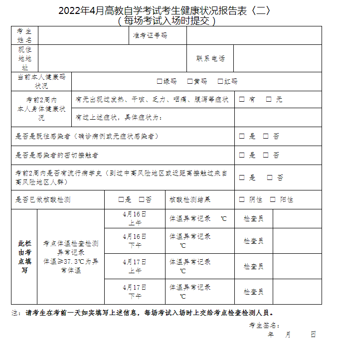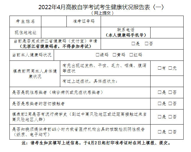 三、所有考生须在考前14天通过“浙里办”APP或“支付宝”申请“浙江健康码”,并开展自我健康监测,每日自行监测体温。参加考试前,须事先报告本人健康状况:如实填写《2022年4月高教自学考试考生健康状况报告表》(<一>、<二>);表<一>于4月 2日起打印准考证时在网上填报并递交,表<二>在打印准考证时,系统按考生报考课程门数提供1至4份下载,考生打印并按要求填写后在每场考试入场时上交健康监测人员。