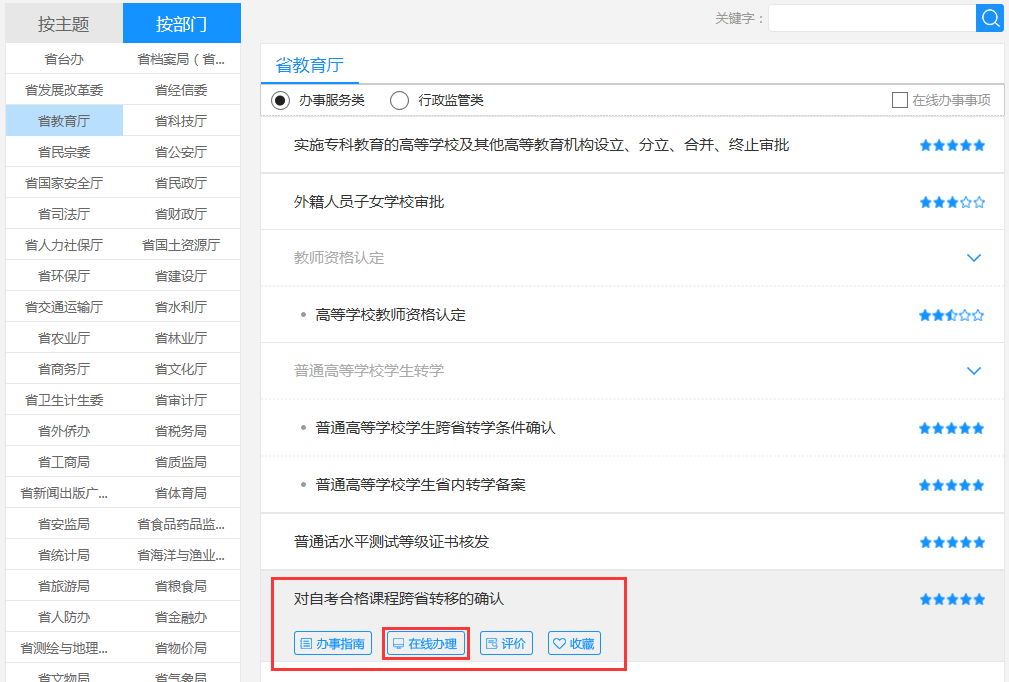(二)考生登录浙江政务服务网(www.zjzwfw.gov.cn)或浙江省教育考试网(www.zjzs.net)或自学考试信息网(zk.zjzs.net)在线申请办理省际转考(转出)。