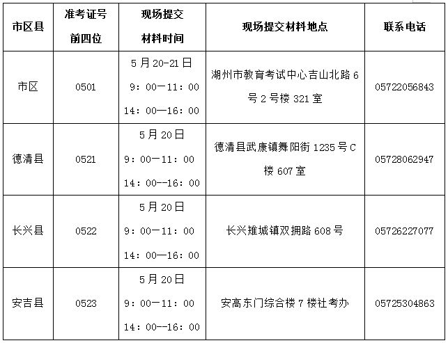 | 市(县区) | 准考证前四位 | 提交日期(5月) | 工作时间 | 现场提交材料地点 | 联系电话 |