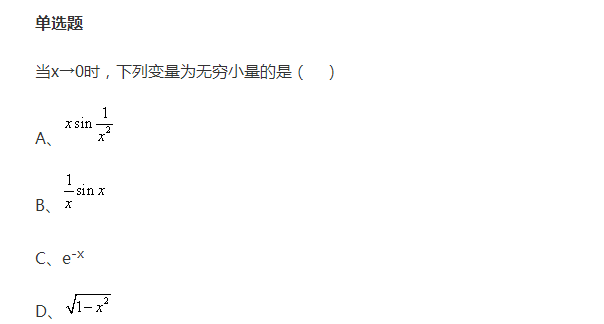 ,所以是无穷小量,A项正确。B、C、D三项极限值都是1,都是有界变量。