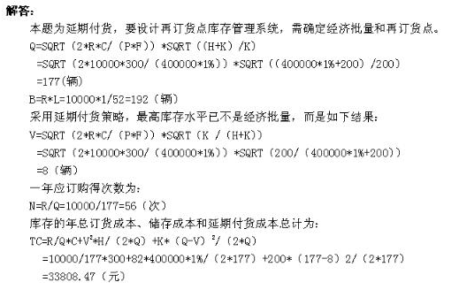3、一汽大众公司生产的奥迪牌汽车的市场需求非常旺盛,经销商往往采用延期付货 的策略满足需求。某经销商预计奥迪牌汽车的年需求量为 10000 辆,每份订单的 订购成本为 300 元,年储存成本为 1%。奥迪车的运到价为 400000 元,如果延期 付货的成本为 200 元。订货提前期为 1 周。试为奥迪车设计再订货点库存管理系 统?如果采用你的设计,那么经销商的最高库存水平将是多少?该经销商的一年 订货多少次?库存的年订货成本、储存成本和延期付货成本总计可控制在什么水 平?