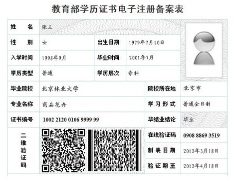 学信网《教育部学历证书电子注册备案表》打印件样张