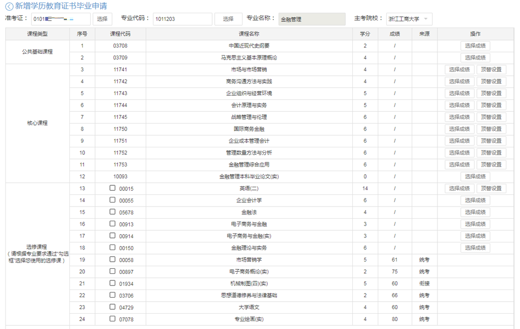 考生选定准考证、专业、主考院校后,系统自动显示考生申请毕业专业的计划及考生已取得的对应课程、成绩(包括免考)。考生须清楚计划下列的“说明”和“专业要求说明”,特别是其中关于选修课程的说明。考生勾选用于选修课程的课程。