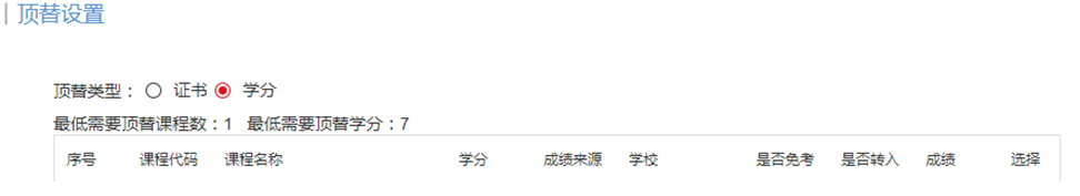 注意事项:使用等级证书的,证书编号填写等级证书上的“证书编号”,成绩填写“合格”。使用笔试合格证或成绩通知单的,证书编号填写笔试合格证或成绩通知单上的“准考证号”,成绩填写实际成绩。选择若干课程学分顶替,被选择的课程无法再被选为选修课程。