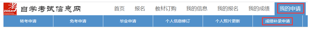 ③考生个人信息正确,有课程合格证书或已审批同意的免考审批表或已审批同意转入的转考审批表,但在自学考试信息网(zk.zjzs.net)无法查到相关课程的。考生须先申请补录成绩并提交审核。