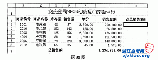 38.使用Excel单元格绝对引用方法,计算下列题38图所示的“占总销售额%”。其中每一商品的“占总销售额%”的计算公式为:=每一商品的“销售金额”÷“总销售额”,