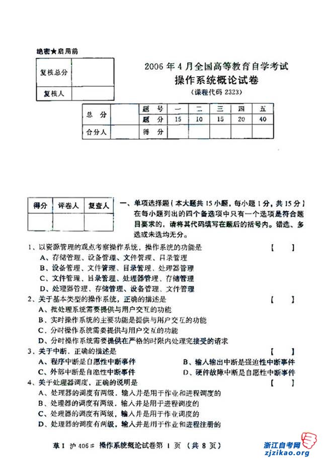 2006年4月全国自考02323《操作系统概论》试题(浙江自考)