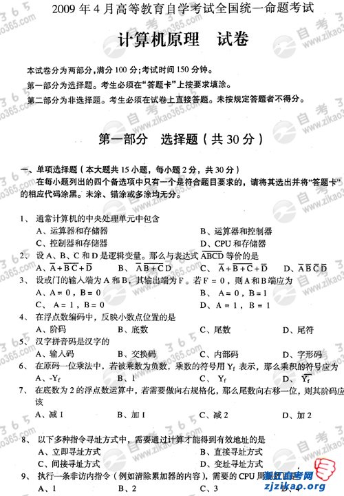 2009年4月全国自学考试《计算机原理》试题 课程代码:02384.doc
