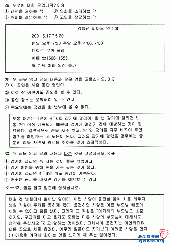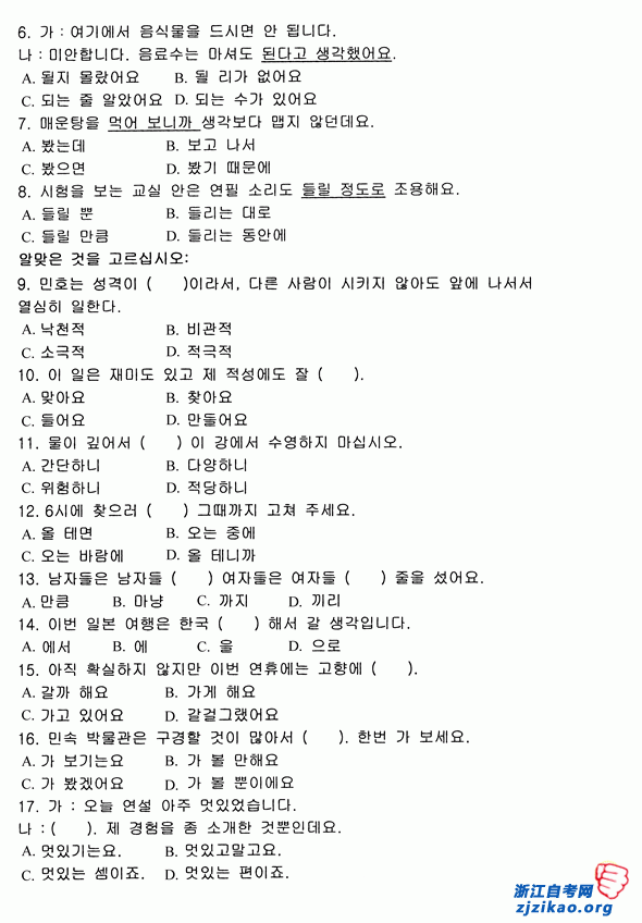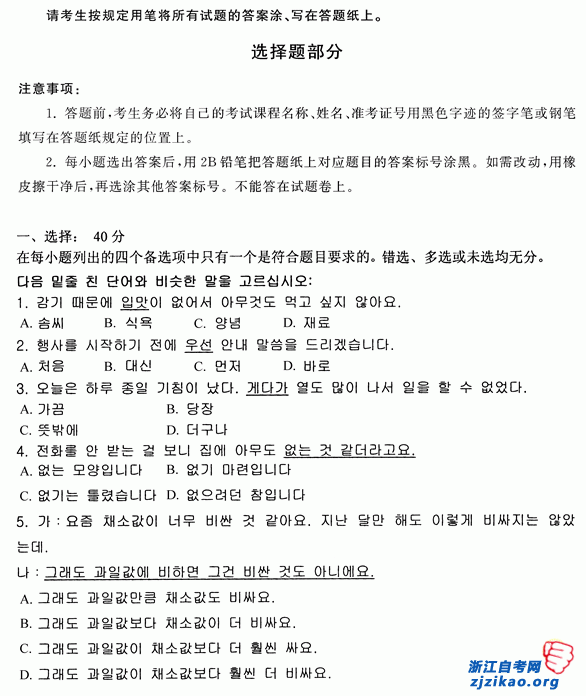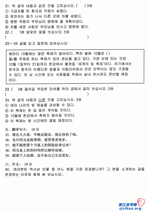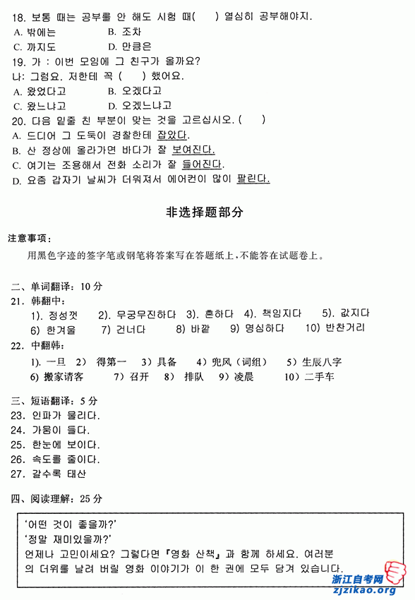 浙江省2012年10月自考01105中级韩国语(一)试题