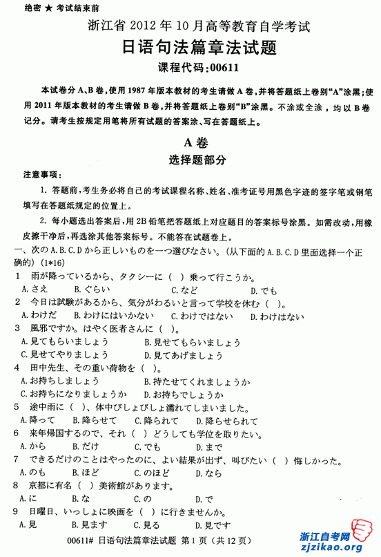 浙江省2012年10月自考00611日语句法篇章法试题