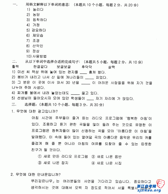 浙江省2012年7月自考《01113韩国语阅读》试题