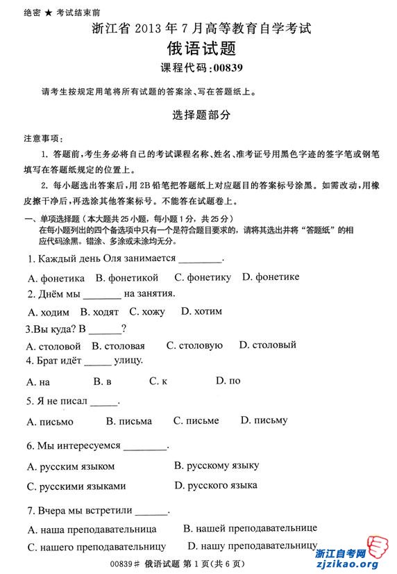 浙江省2013年7月高等教育自学考试俄语试题课程代码:00839