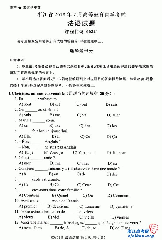 浙江省2013年7月高等教育自学考试法语试题课程代码:00841